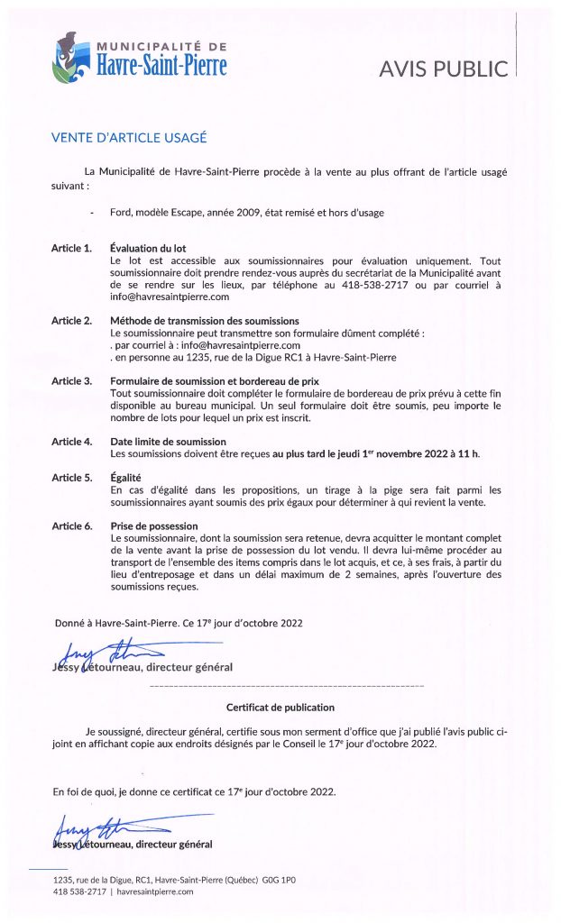 AVIS PUBLIC | Vente d’article usagé – 3e affichage