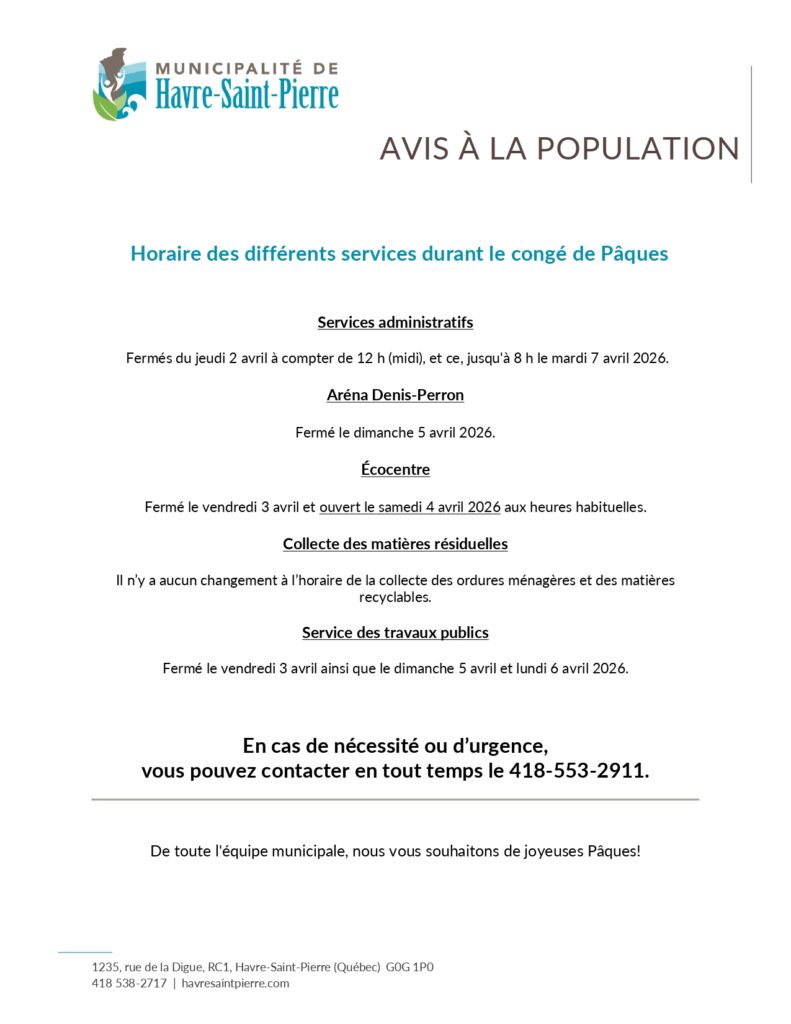 CONGÉS DE PÂQUES | Horaire des différents services